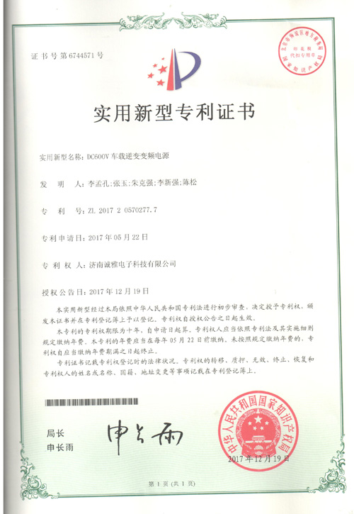 濟(jì)南誠(chéng)雅電子科技有限公司自主研發(fā)生產(chǎn)的DC600V車載逆變電源榮獲國(guó)家實(shí)用新型專利證書